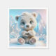 A cute polar bear cub with big, expressive eyes and paws in a heart position sits in a snowy landscape surrounded by sparkling ice crystals