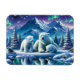 A mother polar bear and her two cubs are sitting on a snow-covered bank in front of a frozen lake. Snow-covered pine trees line the background beneath a night sky filled with the Northern Lights. Several small birds rest on the snowy banks of the lake. The reflection of the bears and the aurora borealis shimmers in the water.