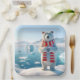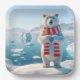 A polar bear wearing a red and white striped scarf stands on an icy landscape, holding its paws in the shape of a heart