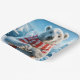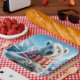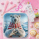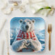 A polar bear is wearing a red and white striped scarf forming a heart shape with its paws
