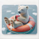 A polar bear floating on a life preserver in the arctic water sipping a drink from a red party cup