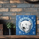 A portrait of a polar bear drawn in an art nouveau style. Snowflakes all around the polar bear against shades of blue backdrop.