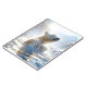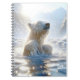 A polar bear joyfully splashes in icy water, surrounded by sunlight and snow-covered mountains