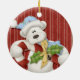 A polar bear with a big red and white candy cane on a red striped background keepsake holiday ornament.