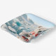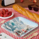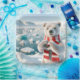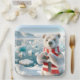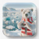 A polar bear wearing a red and white striped scarf stands on a glacier forming a heart shape with its paws