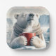 A content polar bear enjoys a steaming cup of hot beverage wrapped in a cosy scarf surrounded by a vast icy landscape.