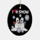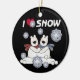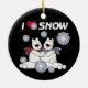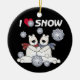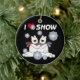 Two polar bears engage in a bear hug as snowflakes fall and text reads "I Love Snow" on keepsake holiday ornaments that you can change the shape of before ordering!