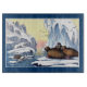 A beautiful and colourful engraving, circa 1860, of Polar Bears, Walrus, and seals on Arctic ice, with the sun low on the horizon in the background.