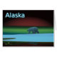 A polar bear roams the ice during the long polar night; the Northern Lights in red and green glow in the distance. Text reading "Alaska" in glowing blue and white also appears.