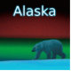 A polar bear roams the ice during the long polar night; the Northern Lights in red and green glow in the distance. Text reading "Alaska" appears in glowing blue and white.