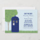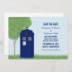 Quirky and fun Police Box Save the Date Announcement featuring a brilliant blue vintage police box in a pretty field with a tree in the background. Easy to customise, simply add your wedding details in the text fields provided. Click "Customise It" to find more personalisation options.