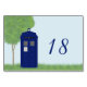 Quirky and fun Police Box Wedding Table Number Card featuring a brilliant blue vintage police box in a pretty field with a tree in the background. Easy to customise, simply add the text of your choosing in the text fields provided. Click "Customise It" to find more personalisation options.