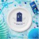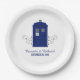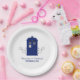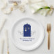 Quirky and fun Police Box Wedding Paper Plates featuring a brilliant blue vintage police box flanked by swirl flourishes and blue stars. Easy to customise, simply add your wedding details in the text fields provided. Click "Customise It" to find more personalisation options.
