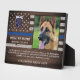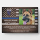 Honour your best partner and police dog for his dedicated years of service with this Thin Blue Line Police Dog Retirement Appreciation Photo plaque. Personalise with your police K9 officer's photo, name, personal message, service dates and service years. Also personalise with badge, department logo or seal. Perfect for police K9 handler gifts or police departments to honour a retiring police dog. COPYRIGHT © 2020 Judy Burrows, Black Dog Art - All Rights Reserved. Police K9 Dog Law Enforcement Officer Retirement plaque
