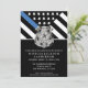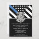 This design features a police force flag with black and white stripes, and a thin blue line stripe as well. The police badge and silver text sits above all of the party details for the retiring law enforcement officer, sheriff, captain, or chiefs retirement party details.