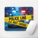 Yellow police tape with "DO NOT CROSS" text is prominently featured, blocking the view of a police car with flashing lights