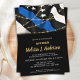 Thin Blue Line Police Graduation Invitations . Celebrate your new police academy graduation, and invite friends and family to your police officer graduation party with this Thin Blue Line Flag Police Graduation Invitation. USA American flag design in Police Flag colours, modern trendy black white and blue with gold string lights design. This police officer graduation invitation is also perfect for police retirement invitations, change venue in personalisation. See our collection for matching police graduation gifts, police academy graduation party favours, and supplies. COPYRIGHT © 2021 Judy Burrows, Black Dog Art - All Rights Reserved. Police Officer Graduation Thin Blue Line Invitation
