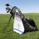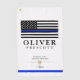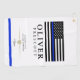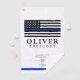 A custom police officer anniversary-themed tall white golf towel tailored to law enforcement. The thin blue line and police flag is representative of American Police and personnel.