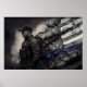 Honor law enforcement service and sacrifice with this powerful Thin Blue Line police wall art poster. This dramatic design features a police officer in tactical gear standing in front of an American flag with the iconic blue line materializing and emanating from behind him in smokey, ink-like, cinematic artist effects, creating a bold tribute to courage, duty, and resilience.