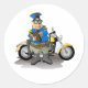 No one wants to be pulled over and given a ticket but that is exactly what is happening here. This design has a police officer standing by his motorcycle writing a ticket. He is wearing dark shades. This police officer writing a ticket design looks great on these stickers. Perfect for yourself or as a gift