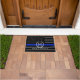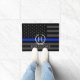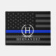 A Monogrammed and custom name doormat featuring a thin blue line police styled American flag. The monogram is centred inside of a white stylised wreath with the last name text in white text underneath. An elegant and stylish way to make an impression on your doorstep While representing the blue.