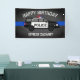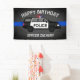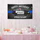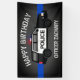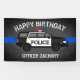 Police theme birthday featuring illustrations of thin blue line, and police car SUV. White text.