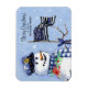 This holiday magnet greeting for police and law enforcement features a whimsical snowman wearing a police hat and blue plaid scarf carrying a thin blue line American flag decorated with festive red berries. Personalise with your name and greeting. Designed by world renowned artist Tim Coffey.