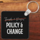 Pro Gun Control keychain design has "thoughts & prayers" lined out and replaced with "Policy & Change", addressing the never ending gun violence in America.