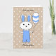 Personalised Easter bunny card for boys. The front of this cute Easter card for kids features a bunny wearing blue overalls and holding a matching Easter egg balloon. The bunny stands in front of a light brown and white polka dot background. The inside card message and back can also be personalised. This personalised bunny Easter card for son, grandson, godson and more would make a sweet keepsake for him.