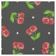 This vibrant fabric features a playful pattern of bright red cherries scattered across a deep charcoal background, complemented by small white polka dots. The rich contrast between the red cherries and the dark background creates a striking visual appeal, perfect for adding a fun and retro touch to your sewing projects. Ideal for creating unique apparel, accessories, or home decor, this fabric brings a burst of colour and charm to any design.