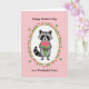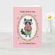 This card shows a sweet illustrated woodland creature with soft grey fur, dark face markings, and a striped tail, standing upright as if stepping forward with affection. It cradles a bouquet of bright fuchsia flowers with slender green stems, and its gentle gaze suggests a close, caring bond ❤️. The character sits inside a white oval frame, surrounded by a leafy green wreath dotted with small pink blossoms and tiny star-like accents. A light pastel pink background fills the page, keeping the scene calm and tender without feeling busy. Curved dark brown lettering appears above the oval and another line sits below it, neatly aligned to follow the frame’s shape. The flowers add the strongest colour contrast, drawing your eye straight to the offering and the creature’s small, careful hands 🌼. Around the oval, the green leaves alternate with pink blooms, and the little star shapes are scattered like soft sparkles near the wreath.