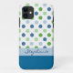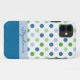 Protect your iPhone 5 in this pretty case. With a real girly girl look, this case is done in white, with a green and blue polka dot pattern, on top, and a solid blue on the bottom of the case. A light blue stripe runs across the middle, with custom blue script text. Personalise this pretty case for yourself or as a great gift idea.