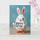 This card features a smooth, egg-shaped bunny figure standing front and center against a softly blurred sky-blue background 🐰. The figure is bright white with small blue polka dots, and its long ears show orange-red inner panels that match its tiny round feet. A small red nose, faint pink blush on the cheeks, and wide black line-drawn eyes create a friendly, tender expression, with a little tongue peeking from the smile like it’s sharing a private joke. Held close to its body, as if offering it to someone special, is a white rectangular sign hanging from a simple twine bow. The words “HAPPY EASTER” sit in the middle of the sign in black uppercase lettering, standing out clearly against the white space 🌷. Soft, even lighting adds a gentle sheen to the figure’s smooth surface and keeps shadows minimal while the background stays dreamy and out of focus. The twine is tied at the top of the sign in a small bow, with thin strands leading up to the bunny’s hands.
