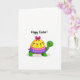 This greeting card features a friendly green turtle-like character centered along the lower half of a white background, smiling with big, gentle eyes that give it an affectionate, companionable look. Its rounded shell is styled like a tiered celebration display, suggesting a sweet shared moment rather than a solo pose. The top tier is sunny yellow with small white dots and tiny pink tulip-shaped flowers, followed by a bright pink middle tier with matching white dots. The bottom tier is purple with neat white ring patterns, and a large fuchsia bow sits on top like a gift-ready accent. Near the top of the card, the words “Happy Easter!” appear in a flowing, casual style in a dark tone, centered above the character. A few spring touches, like 🌷-shaped blossoms on the shell, add a soft seasonal cue, and a small 🐰 or 🐇 emoji would fit naturally beside the greeting. The white space around the turtle keeps the focus on the stacked shell colors and the bright bow, with the pink flowers and white dot details clearly visible.