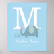 Cute initial monogram nursery poster, featuring your baby's name and the year that they arrived with sweet polka dot parent and baby elephants on a soft blue background.A lovely keepsake to treasure!