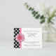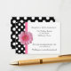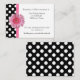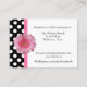 Pretty white wedding reception enclosure cards, with a black and white polka dot pattern, on the left front and covering the back of the card. Graphics of a pink ribbon runs down the left side of the front next to the polka dots, with a pink Gerber daisy decorating the middle, of the ribbon. Black text is ready to personalise for your wedding.