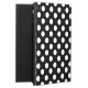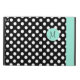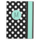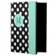 Stylish iPad Air folio style case with built in stand done in a black and white polka dot. A mint green band, running down the right front edge and a decorative mint green disc, on the middle front, has a black one letter monogram ready to personalise. Makes a great personalised gift idea.