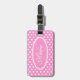 Modern girls bright pink polka dot patterned graphic luggage tag. Perfect for holidays and trips. Add your name and initial to front of tag and customise the reverse of this tag with your name and address details. Designed exclusively by Sarah Trett.