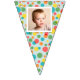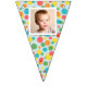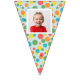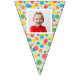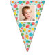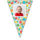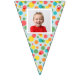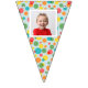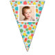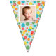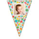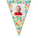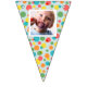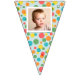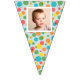 Add a special touch to any celebration with this custom bunting garland. It's ready to be customised with up to 16 of your photos--1 photo on each flag. The photos are set inside of a white frame against a background of colourful polka dots on light blue.