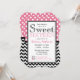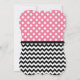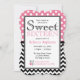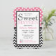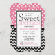 Bracket style, stylish sweet sixteen birthday invitations with white polka dots over pink on the top half and a black & white chevron zigzag pattern on the bottom half. Personalise with the party details and choose your paper type too!