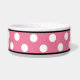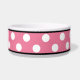 Stylish ceramic dog bowl designed with a big white polka dot pattern over pink and personalised with your pet's name.