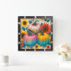 This vibrant square wall clock showcases three whimsical pumpkins, each adorned with colourful polka dots and ombre hues of pink, purple, blue, and yellow. Surrounded by bright sunflowers and candy corn, set against a lively leopard print background, this clock brings a playful and festive autumn touch to any space.
