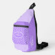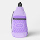 Modern girls purple polka dot and name cross body bag. Personalise with your own name and initial. This example reads: Monica T. Other matching items are available. Design by Sarah Trett for www.mylittleeden.com