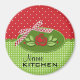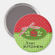 Polka Dot Roses Refrigerator Magnet, Red-is a graphic art design. The top portion of the background is red and white polka dots. The bottom half is green and white polka dots. A thin green ricrac ribbon divides the two patterns. In the centre is a green oval shape holding a red rose with green leaves. A chequered red and white bow embellishes the oval. I have placed two text areas on the magnet for you to personalise. Replace the word NAME with a person's name. The second word says Kitchen. Both text areas can be edited or deleted if you prefer. This polka dot roses design is available in several assorted colours.