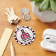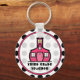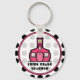 A keychain featuring a black and white polka dot background. Logo of Pink Schoolhouse inside a hot pink frame. Customisable text reads "Third Grade Teacher"