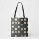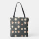 This stylish tote bag features a dark grey background with a pattern of polka dots in various sizes and colours, primarily in shades of white and light pink. The black handles provide a comfortable and sturdy grip, making it ideal for everyday use, shopping, or as a thoughtful gift for friends and family. The playful and elegant polka dot design adds a touch of sophistication to any outfit.