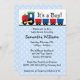 An adorable red and blue train with polka dots are featured on this trendy baby shower invitation. Easily customise with your party details. Illustration by © Sanqunetti Design