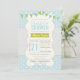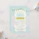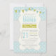 This Baby Shower Invitation features a Polka Dots and Chevron background in blue and grey colours with modern typography. The blue and green bunting flags add to the beauty of the invitation.