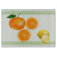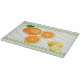 Stylish kitchen glass cutting board done in a green polka dot background, with green and white gingham ribbons, at the top and bottom of the board. Lovely graphics of an orange and orange slices and a lemon and a lemon slice decorate this colourful cutting board. Customise to add any text you want.