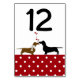 Dachshund themed wedding reception table number card done in white, on top and a red with white polka dots, on the bottom of the card. Cute graphics of a brown and a black dachshund kissing decorates the card, under the bold black number. Personalise the number for each table at your reception. Great with our matching Polka Dots and Dachshunds Wedding Products.